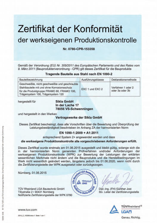 Sikla hat sich den Herausforderungen der Norm EN 1090 gestellt und das Zertifikat über die Konformität der werkseigenen Produktionskontrolle erhalten. siFramo und Simotec Trägersysteme sind zukünftig mit dem CE-Kennzeichen versehen.